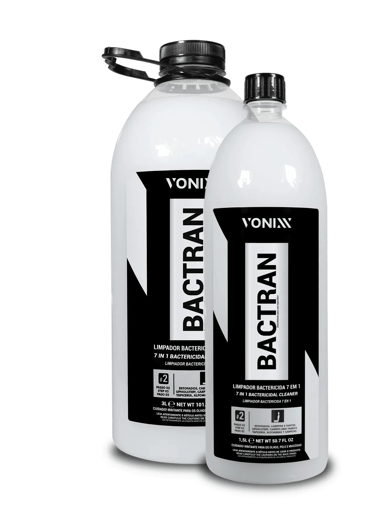 Bactran é um limpador bactericida ultra concentrado de alta performance e baixa espumação, desenvolvido para limpeza profissional de estofados, carpetes e tapetes. Seu uso é indicado com extratoras. Sua fórmula contém tensoativos especiais que agem em sinergia com o peróxido de hidrogênio e remove facilmente os mais diversos tipo de sujeira, em especial manchas de sangue, suco, café e bolores, além de eliminar fungos e bactérias.